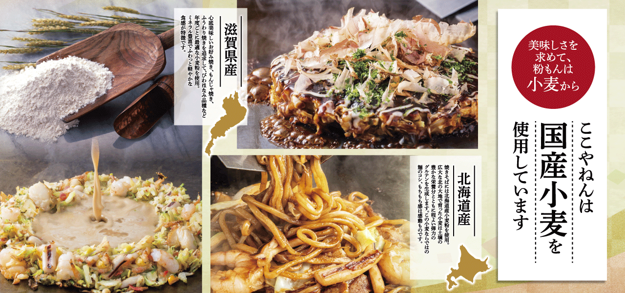 心底美味しいお好み焼、もんじゃ焼を追求して「滋賀県産小麦粉」を使用。ふわっとした軽さとキャベツの甘味をやさしく引き出す最高の小麦粉で味のグレードアップ、安心安全の粉もんをご提供します。